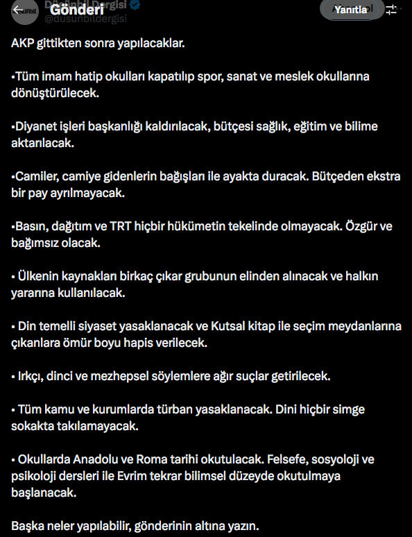Antik yaşam kültürü dergisi Düşünbil dergisinin sosyal medya hesabından paylaştığı AK Parti gittikten sonra yapılacaklar listesi ortalığı karıştırdı.